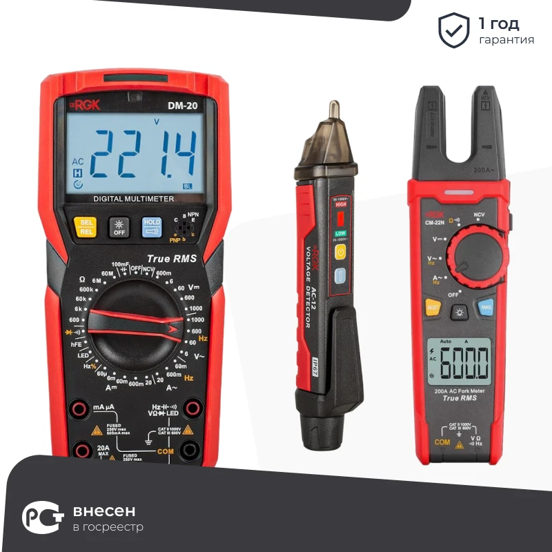 RGK DM-20 цифровой мультиметр с токовыми клещами CM-22N и индикатором напряжения AC-12, 776455/755146/776394 в Казани