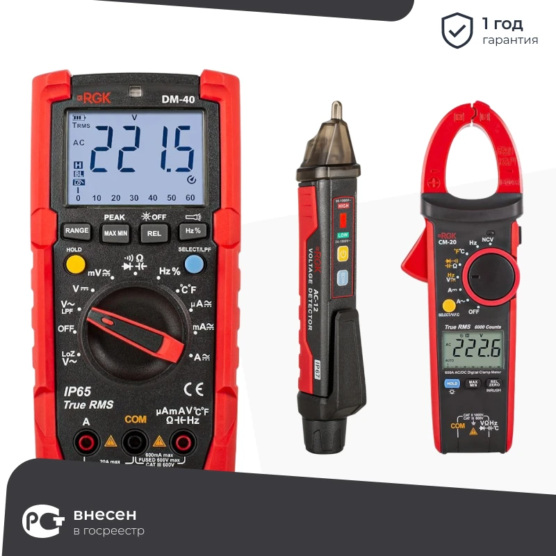 RGK DM-40 цифровой мультиметр с токовыми клещами CM-20 и индикатором напряжения AC-12, 776431/776424/776394 в Казани