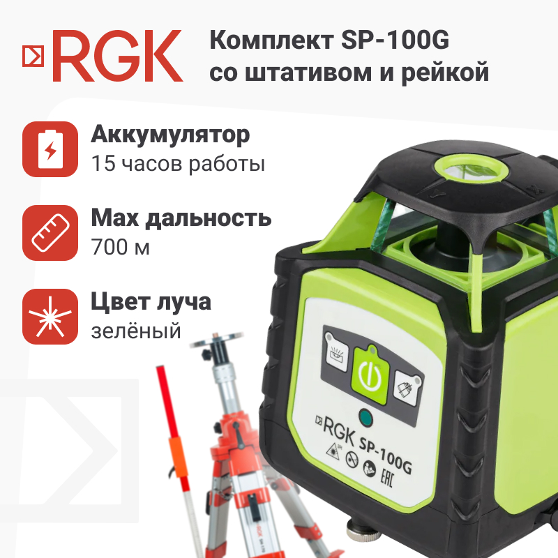 Ротационный лазерный нивелир RGK SP-100G со штативом SH-170 и рейкой LR-2